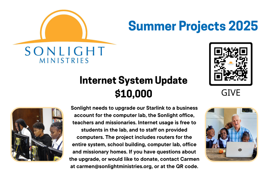 Summer Projects 2025 These upgrades are vital to the continued work of Sonlight Ministries. Would you consider contributing to these projects? If so, you can click the Give link below to donate. Thank you! Give to Summer Projects We appreciate your partnership! Click here